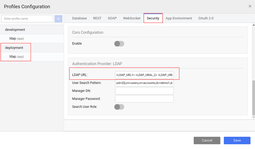 . For deployment profile, you can specify multiple LDAP server URLs, if required, by providing the multiple LDAP URLs as space-separated values, from the security tab of the Profile Configuration.