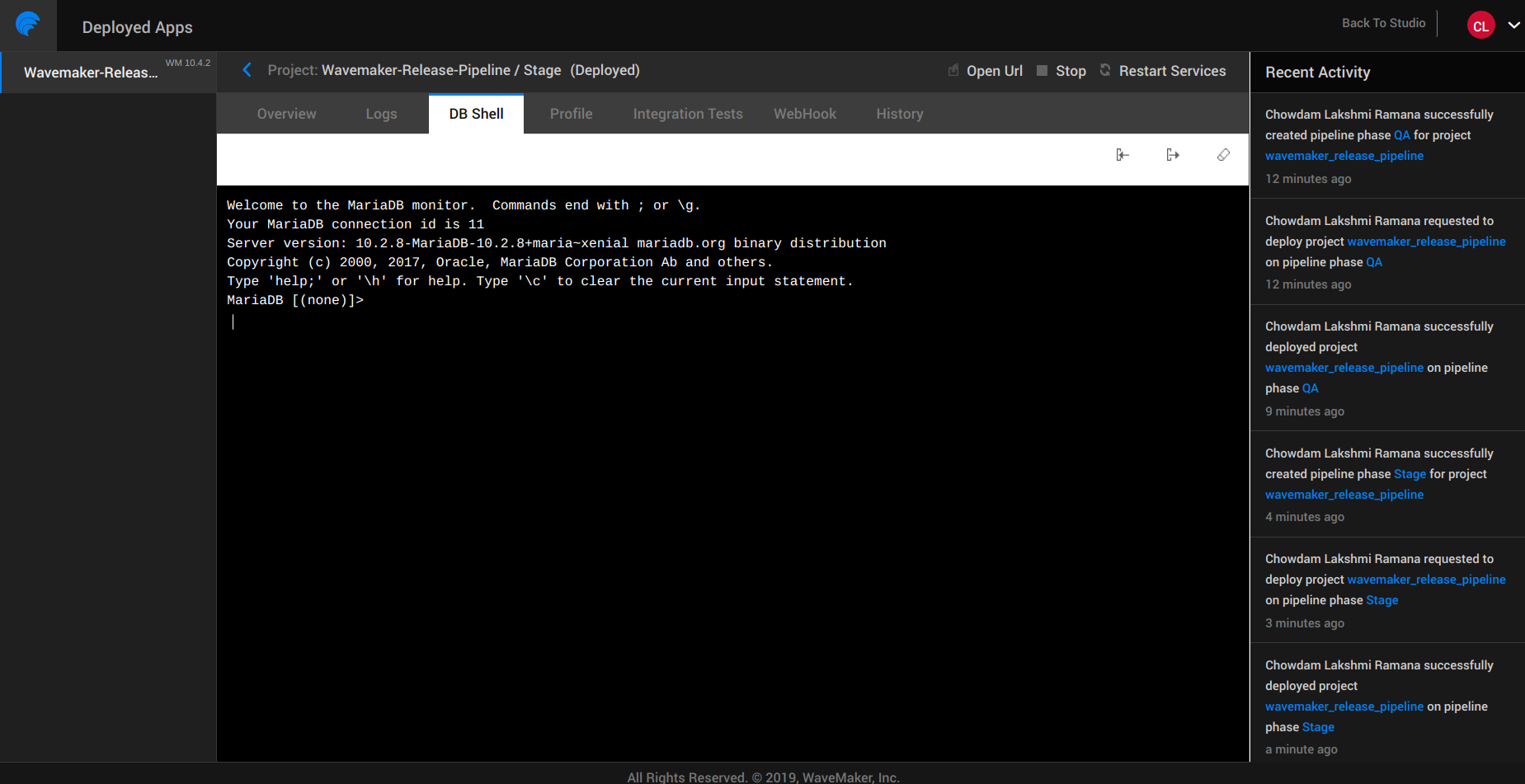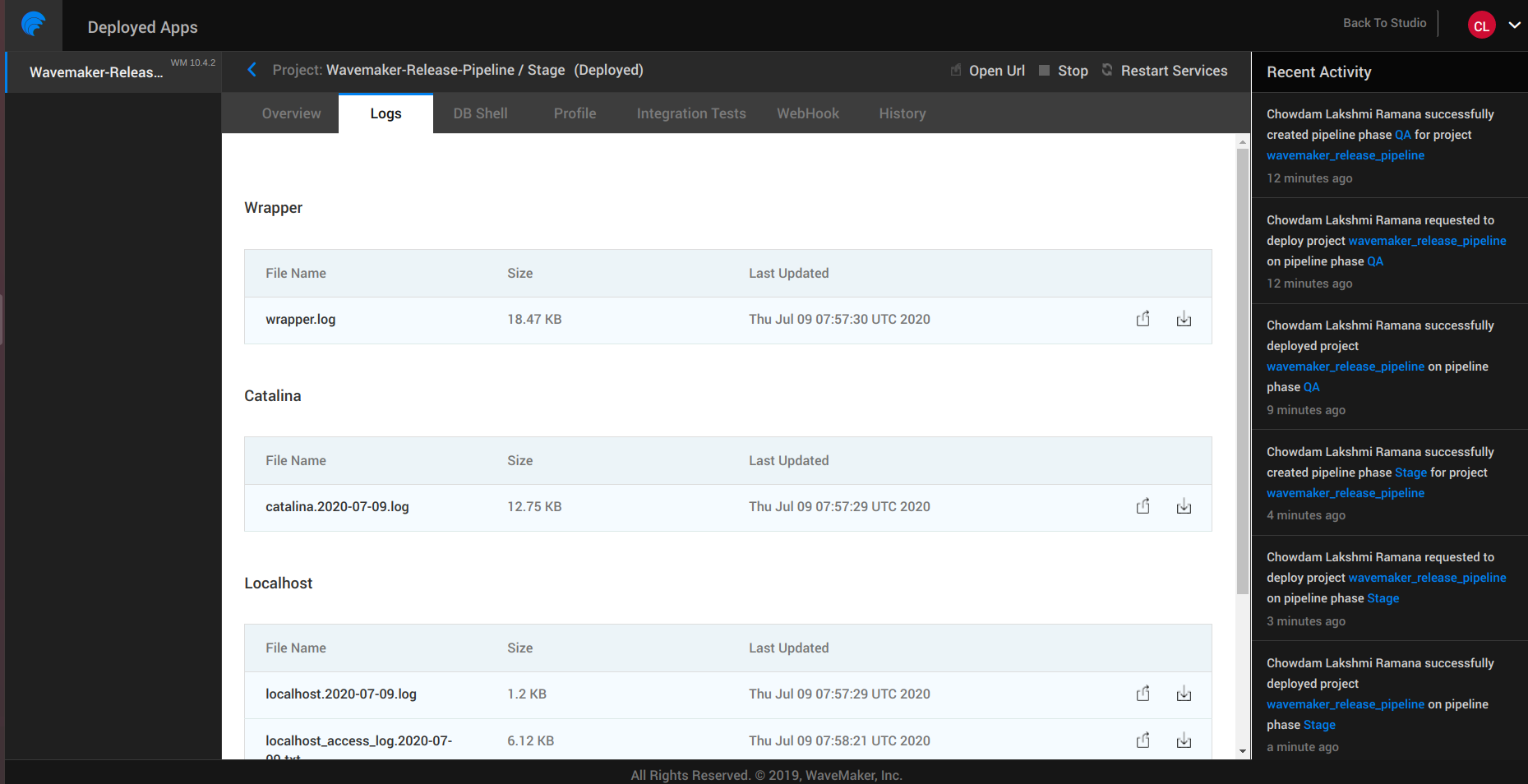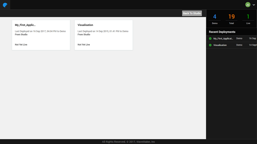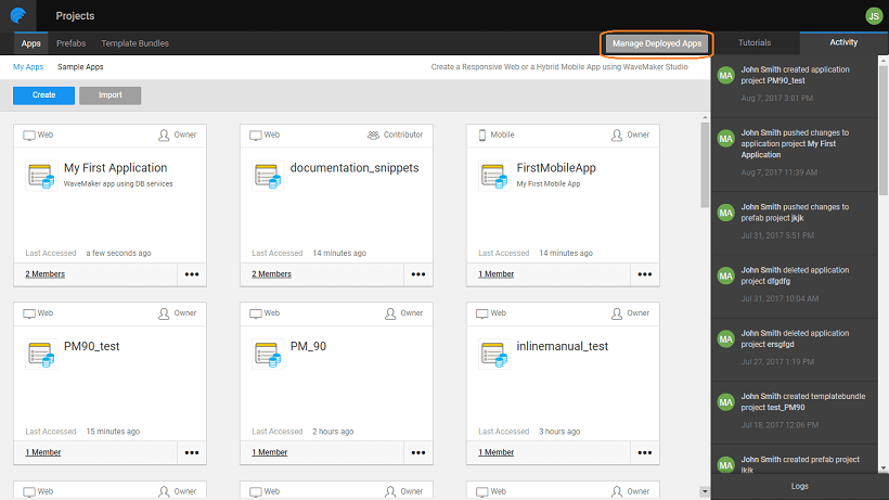 WaveMaker Apps Portal is a place for you as the project owner to manage the deployed apps. The one-click deployment from Studio hosts the app on WaveMaker Demo Cloud using the Deployment Profile. Apps Portal will enable the project owner to configure phases and push the apps from one phase to the next. From this portal you can: