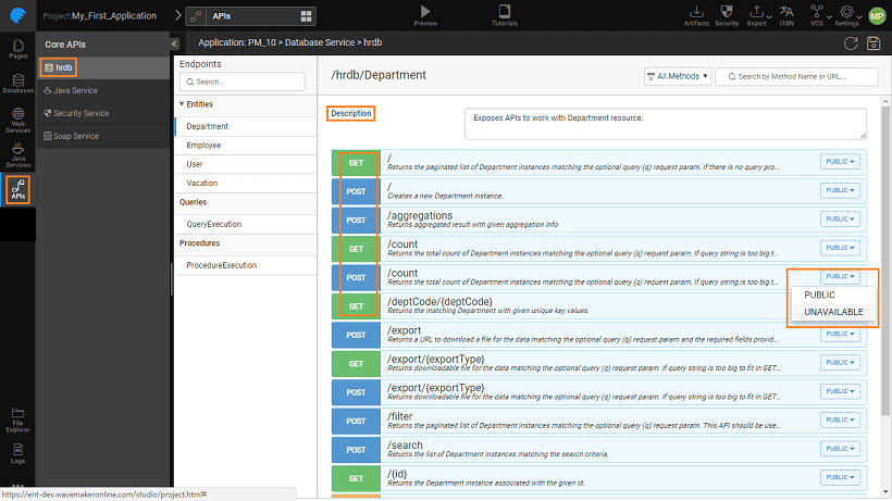 • Unavailable - this setting can be used when you want to disable a particular API method. For example, you want to ensure that records from employee table are not deleted, then making the DELETE method Unavailable will ensure that it does not happen by mistake.