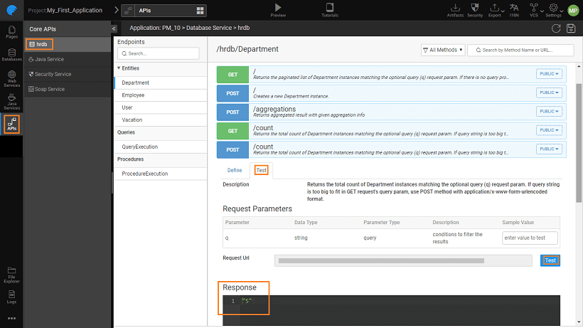 REST APIs generated for CRUD, searching and listing operations for each Database table integrated within the app can be viewed from API Designer. For easy usability, these APIs are categorized under various heads. They are grouped by the database, then entities, queries, and procedures.