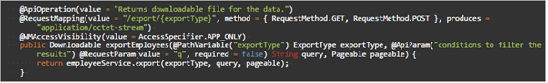 APIs that use HQL Queries: The Filter, Count and Export API in every Table Controller will use the HQL query, which is an optional parameter, for retrieving the data. These APIs can be found in respective tables’ controller class file.