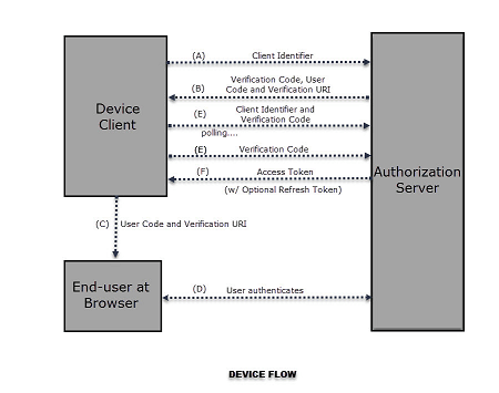 5. While the end-user authorizes (or denies) the client's request (D), the client continuously polls the authorization server to verify if the end-user authorization step is successfully accomplished. The client's request includes the verification code and its client identifier.