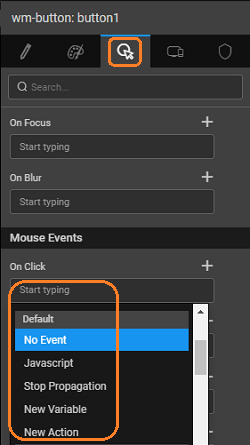 Events provide a way for you to define the actions that take place when something occurs in your application. There are many events that occur within a WaveMaker application. The most common events are user interface events, such as when a user clicks a button. Events are also triggered when an editor's value changes, and even when a Variable gets new data from the server. You have several options for specifying what will happen when a button is clicked.