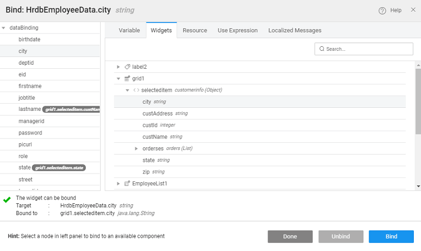 - The Bind dialog displays the binding options i.e. a list of everything that you can bind to, including all variables, widgets and so on. You can bind to widgets, variables that are defined on the current page, or that are defined at the app level.
