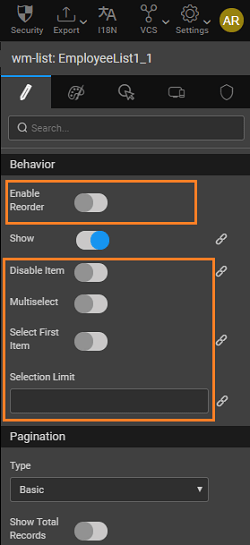 Item Reordering: Enable reorder will allow users to reorder the list items at run-time.