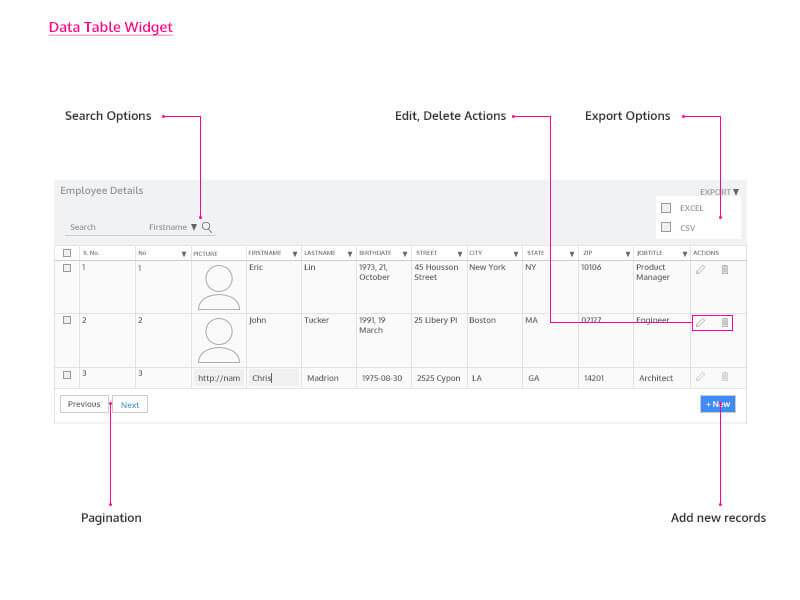 Data Table provides a user interface to perform CRUD operations for data from a database, by integrating the editable actions with their corresponding CRUD APIs that are generated automatically during Database Integration process through Database CRUD variables.