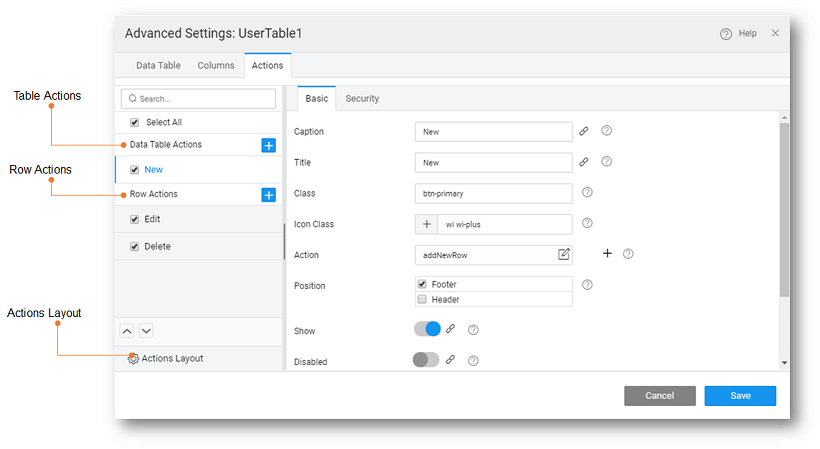 Data Table actions include actions at the table-level and the row-level. These options are available from the Actions tab of the Advanced Settings property of the Data Table.