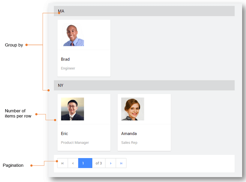 List widget provides a list view of items from a data source. List data can be obtained from various Services like database, queries or web services through Variables. The list provides a variety of flexible templates for defining the display format of each item.