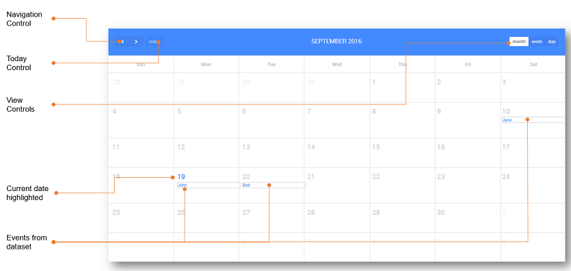 Enable ControlsThis property allows you to enable the header controls for calendar widget. These include - navigation - to navigate previous/next month/week/day(depending upon the display) on the calendar, - today - go to today's location on the calendar, - month - to display entire month, - week - to display entire week, - day - to display entire day. All these controls on the calendar are used to navigate between the months and switch the view to Month(or) Week (or) Day. Note:- This property is shown only for the Web version of the Calendar.