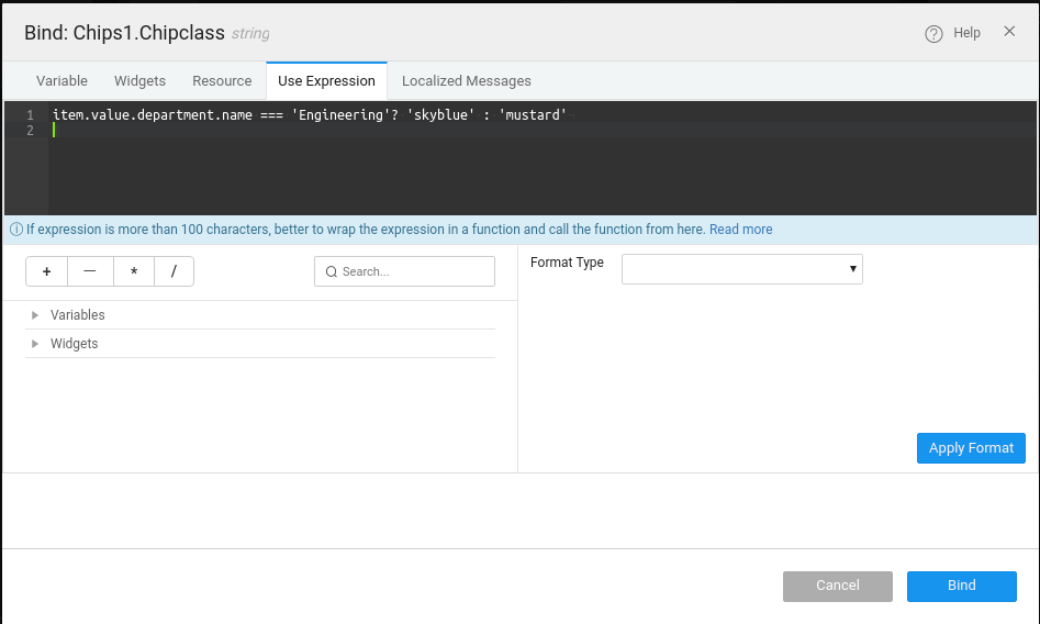 4. From the Styles tab bind the Chip item class name to the following expression: