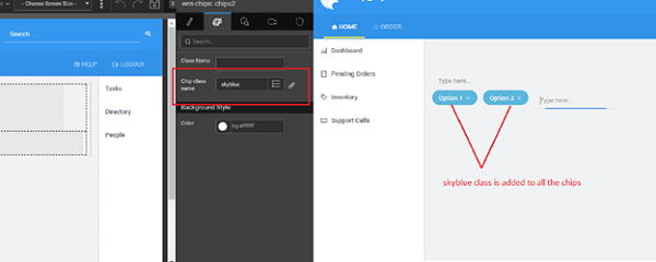 1. Setting the chip item class name (or Class Name property) as skyblue, will apply skyblue class to all the chips at runtime.