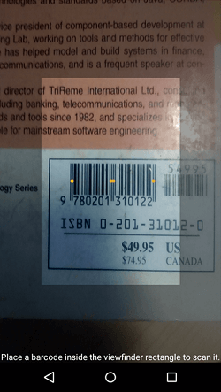 - Click on ‘scan a book’ button. The camera will open for barcode scanning. Point the camera at any book barcode.