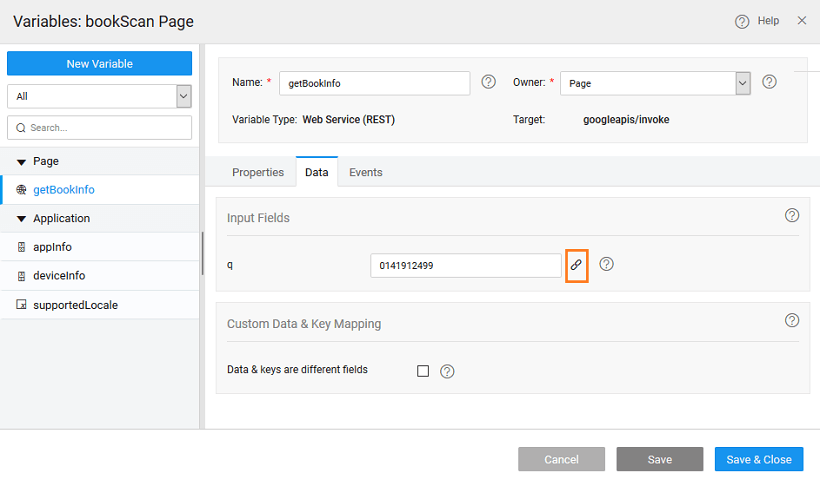 - Bind the value of q with barcode scanner ‘dataValue’ property and save the variable.