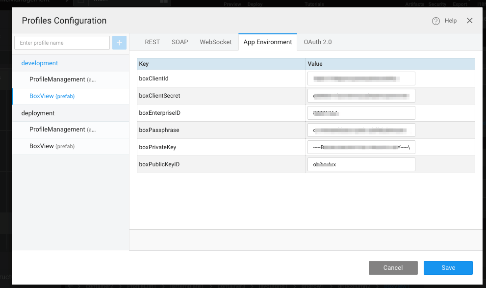 In your app’s Settings > Config profile > Box prefab > App Environment