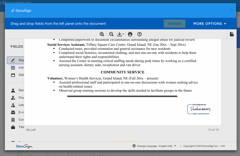 With the above steps done your Docusign prefab integration is complete. Now clicking on the E-sign link will invoke a Docusign dialogue and the your document will appear in the dialogue. Click continue to start the e-signing process. Click on the e-signing options from the left menu and e-sign the document. Then click finish button in the popup to complete the process.