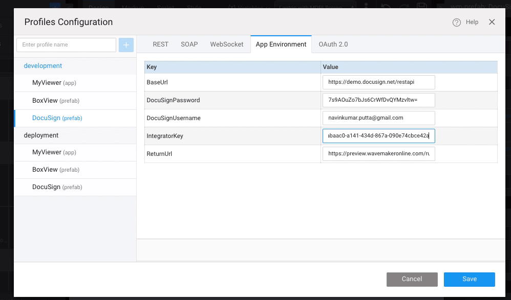- Integrator Key: Provide the Integrator Key derived for your Docusign App from the Docusign Admin console.