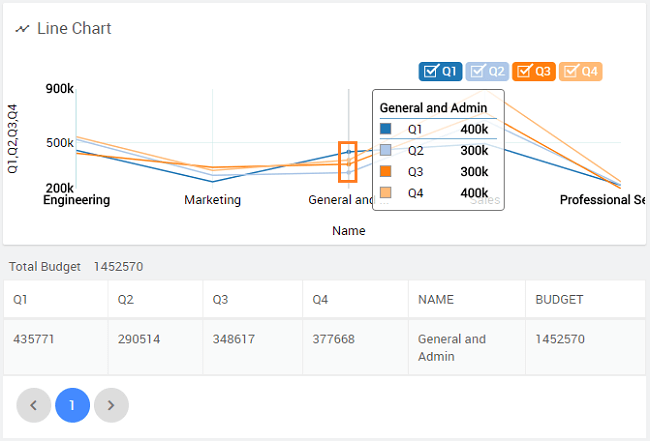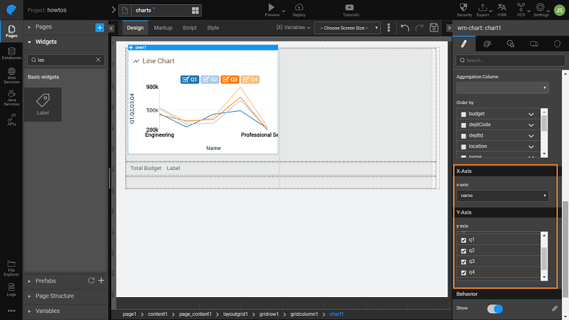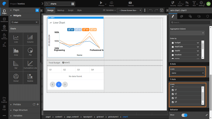 3. Drag and drop a Line chart onto the first Grid row. Bind the chart widget to the Department dataset, and set x-axis to deptCode and y-axis to Q1, Q2, Q3, and Q4