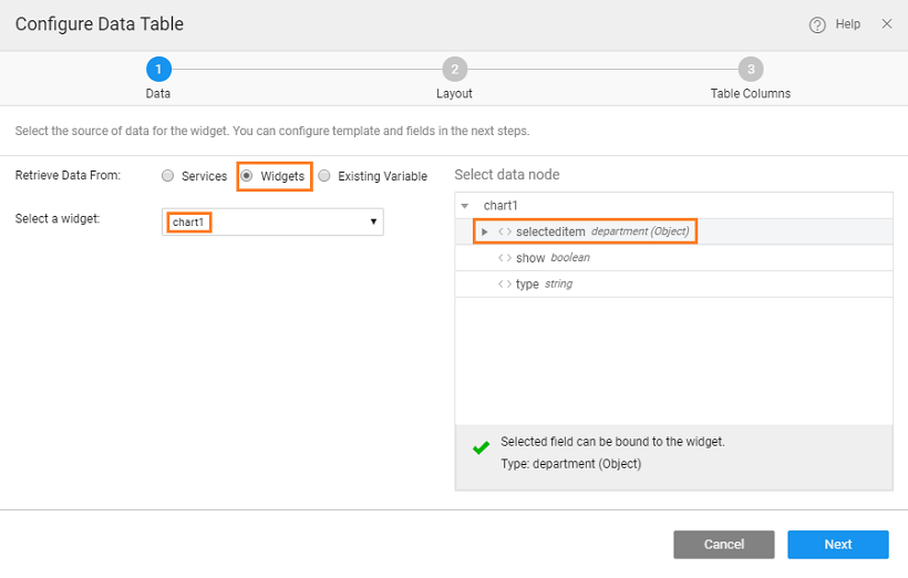 1. Drag and drop a Data Table onto the third row of the Grid. Set the data source of the Data Table to the selected item of the chart widget. Choose the other settings as per your requirements. We have chosen a Read-only table and selected to display department id, name, budget, code, and location.