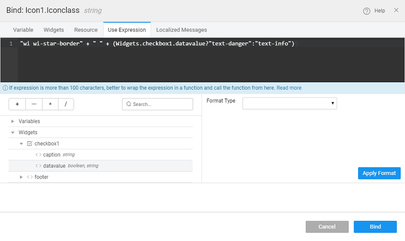 - Click on the Icon widget and for the "Icon Class" property click on the bind icon.