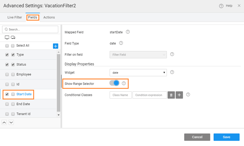 To filter data between given two values, Show Range Selector property from the Advanced Settings can be used. For example, we will how to filter the vacation details of employees between to Start Dates. We are using the hrdb Vacation table for this example.
