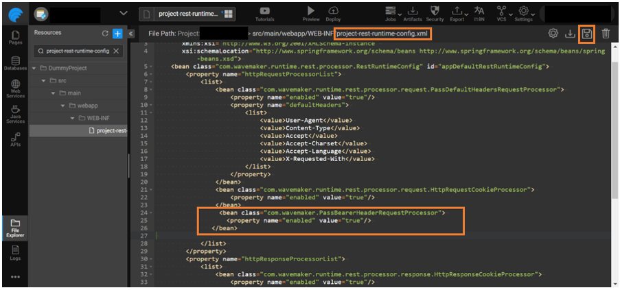 1. Go to the project-rest-runtime-config.xml and add PassBearerHeaderRequestProcessor in the httpRequestProcessorList as a bean. Add the below-provided bean class and click save.