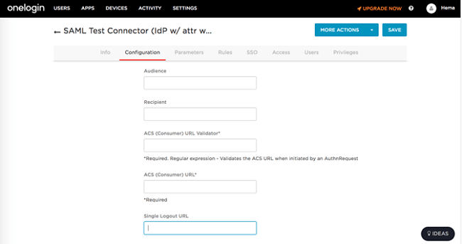 - Copy the Audience URL from the Security Provider Info and paste it in the Recipient, ACS Consumer URL Validator and ACS Consumer URL in One Login Configuration as shown above.