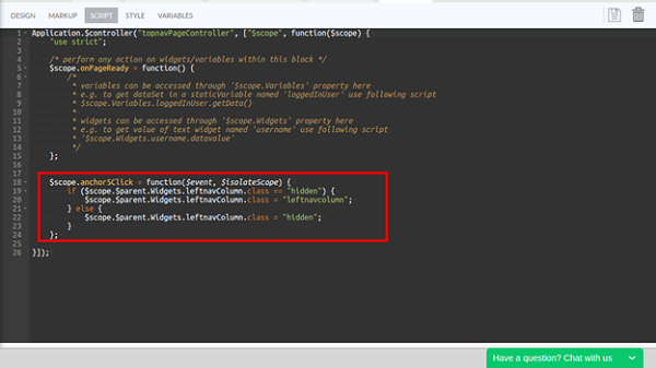5. For the onClick event of the anchor, choose JavaScript as operation. For the function generated in the Script tab of the page, place the below mentioned code snippet: