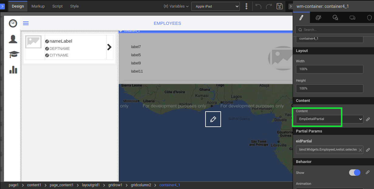 5. Design a partial page that contains the employee profile in detail with Employee ID Param. Bind this partial to the selected-employee based on the Employee ID Partial Param to display the Employee Profile. For more information, see How to create a Partial.
