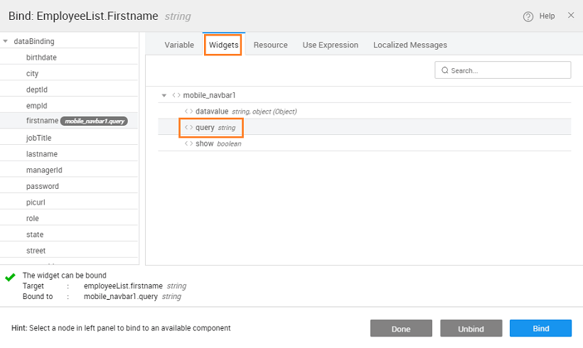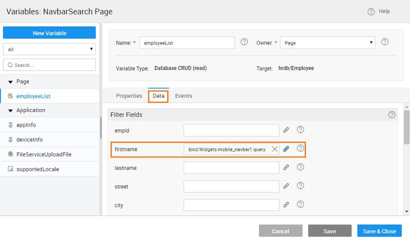 1. From the Data tab of the above Variable, bind the firstname Filter Field to query option under the mobile_navbar Widget