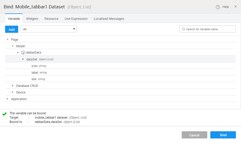 - Select the tabbar and bind Dataset Value property to the dataset of the Model Variable created earlier.