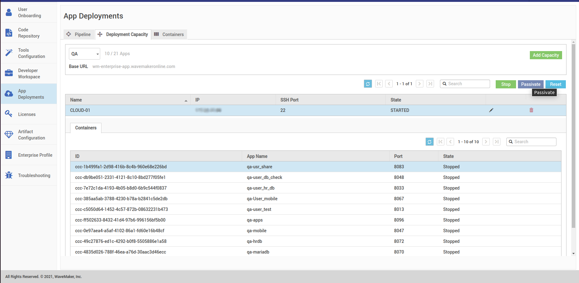 - Then you need to hit the passivate button, this will passivate all the stopped containers in the instance selected, wait till there are no stopped instances present in the instance