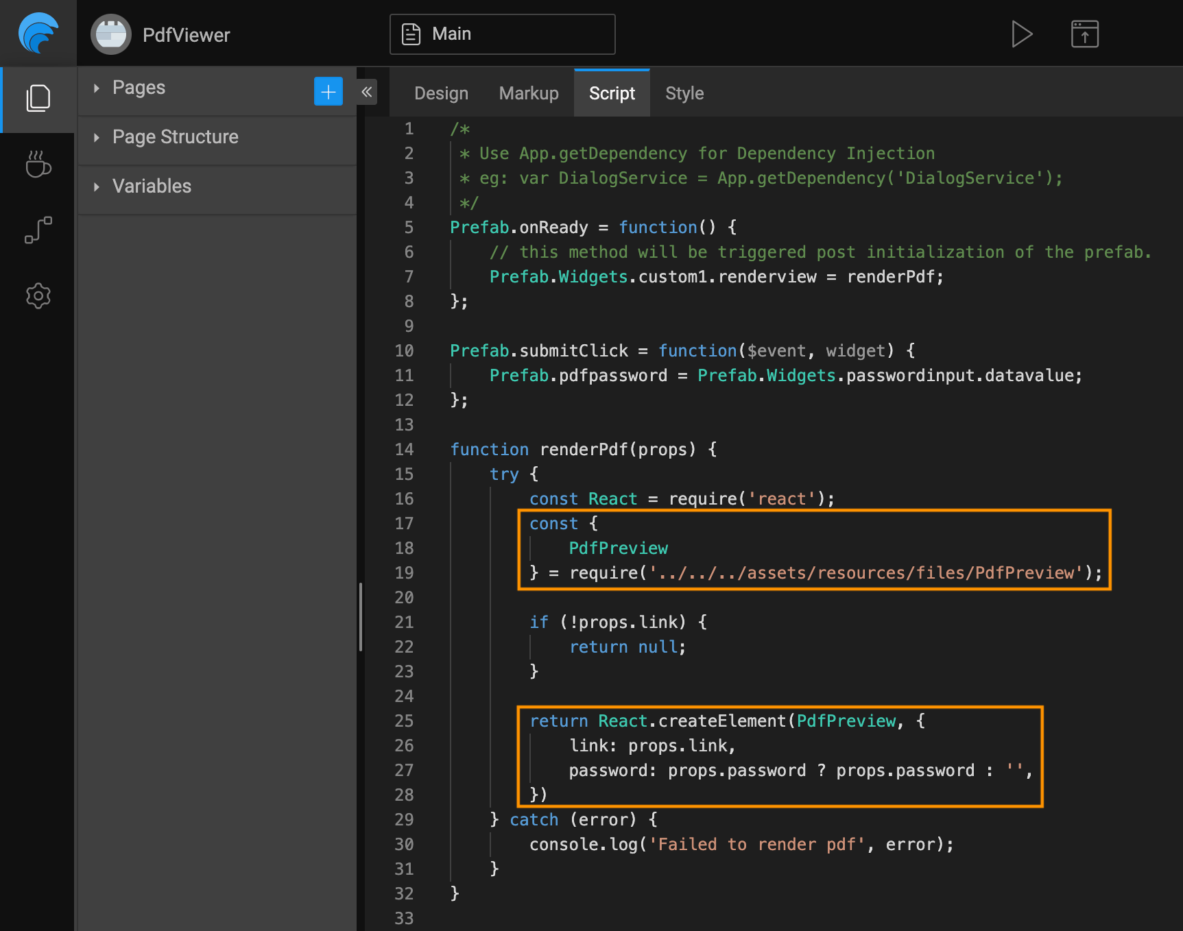 1. Import the PdfPreview module in Prefab's Main Script and pass appropriate props to show pdf on the native mobile platform.