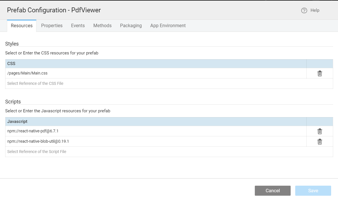 1. Click on Setting icon, then click on Prefab Configuration. Now, select the Resources tab and in Script section add react-native-pdf@6.6.2 and react-native-blob-util@0.19.8 dependencies to the scripts and then click on Save.