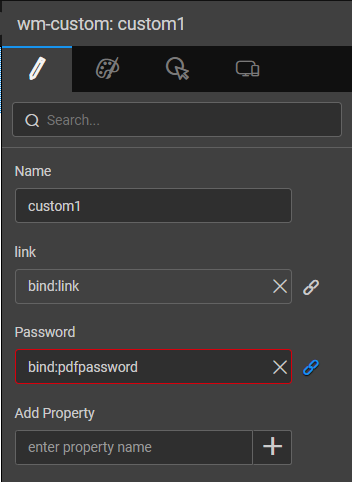 <wm-custom name="custom1" linkparam="bind:Variables.link.dataSet.dataValue" passwordparam="bind:Variables.pdfpassword.dataSet.dataValue"></wm-custom>