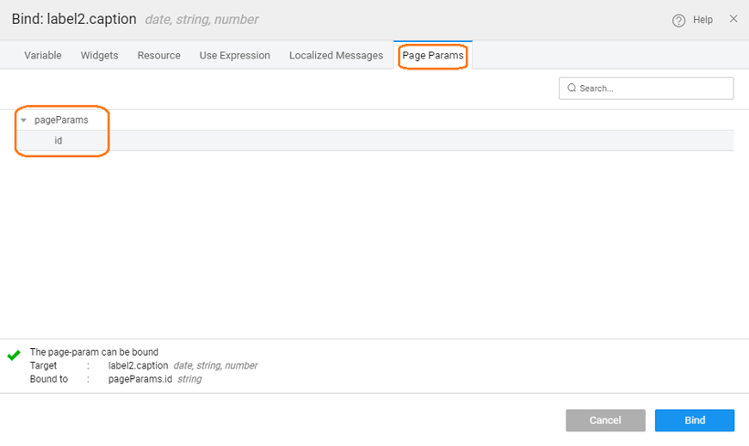- Page Params are available on the page/partial scope and can be used in the same. These parameters can be accessed from the Page Param tab on the binding dialog.
