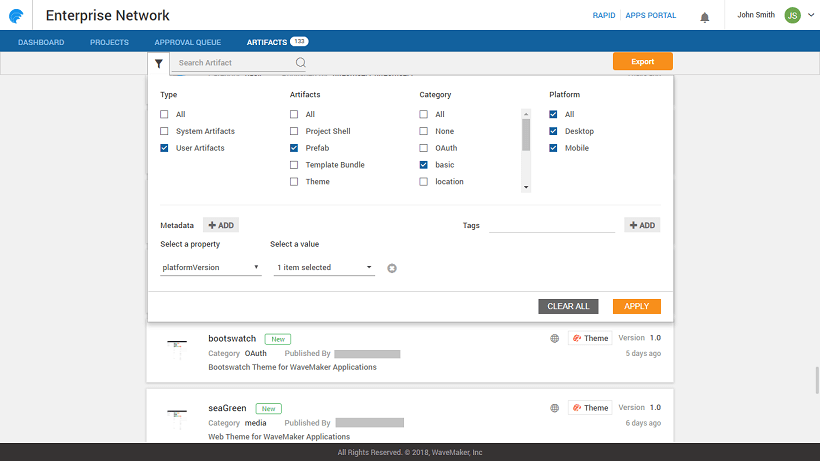 Artifact Repository is a collection of artifacts or resources used across application development lifecycle in WaveMaker platform. It allows for easy exploration and discovery of Artifacts available to the developer network. These artifacts include: