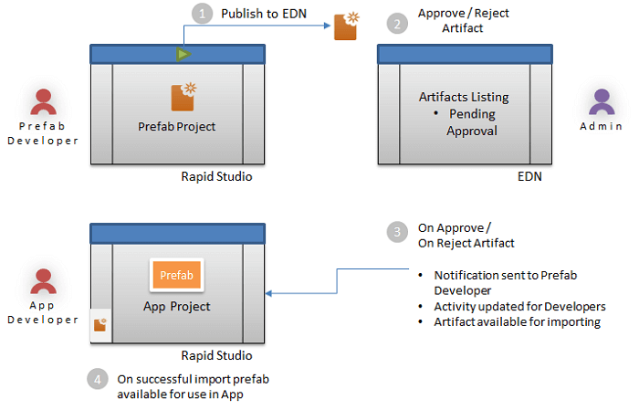 - Publish to EDN (only for enterprise version) – Approval by EDN Admin. Once approved, Prefab has to be explicitly be imported for use within an application.