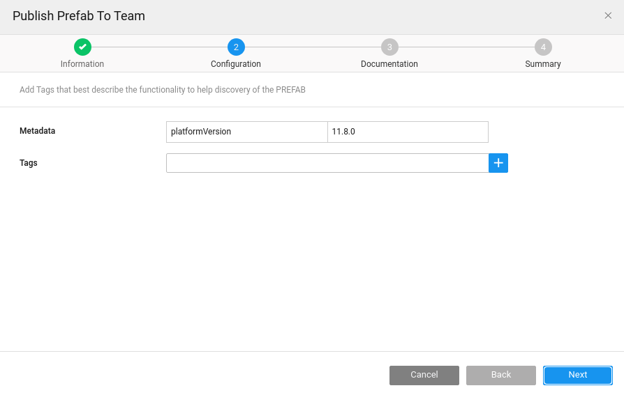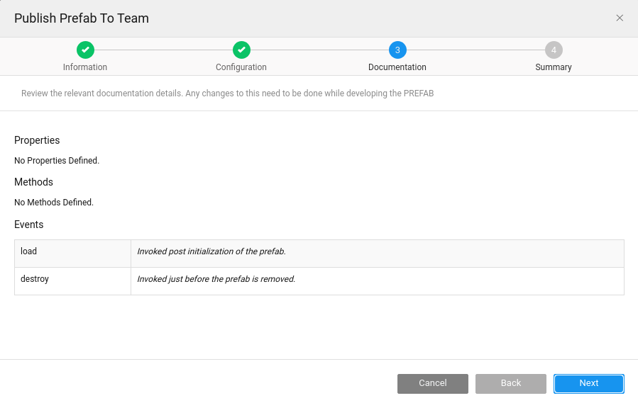 - Documentation (only for Prefabs): This is populated automatically by the platform, from the Configuration Settings entered at the time of the Prefab development. Any changes to this need to be done at the Prefab development time.